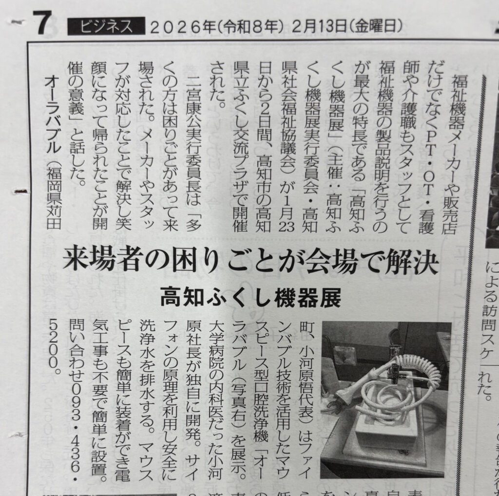 先日、令和8年1月23日(金)・24(土)に開催された「第23回高知ふくし機器展|バリアフリーフェスティバル2025」へ出展させていただいた私共のファインバブル技術を活用したマウスピース型口腔洗浄器「オーラバブル」。