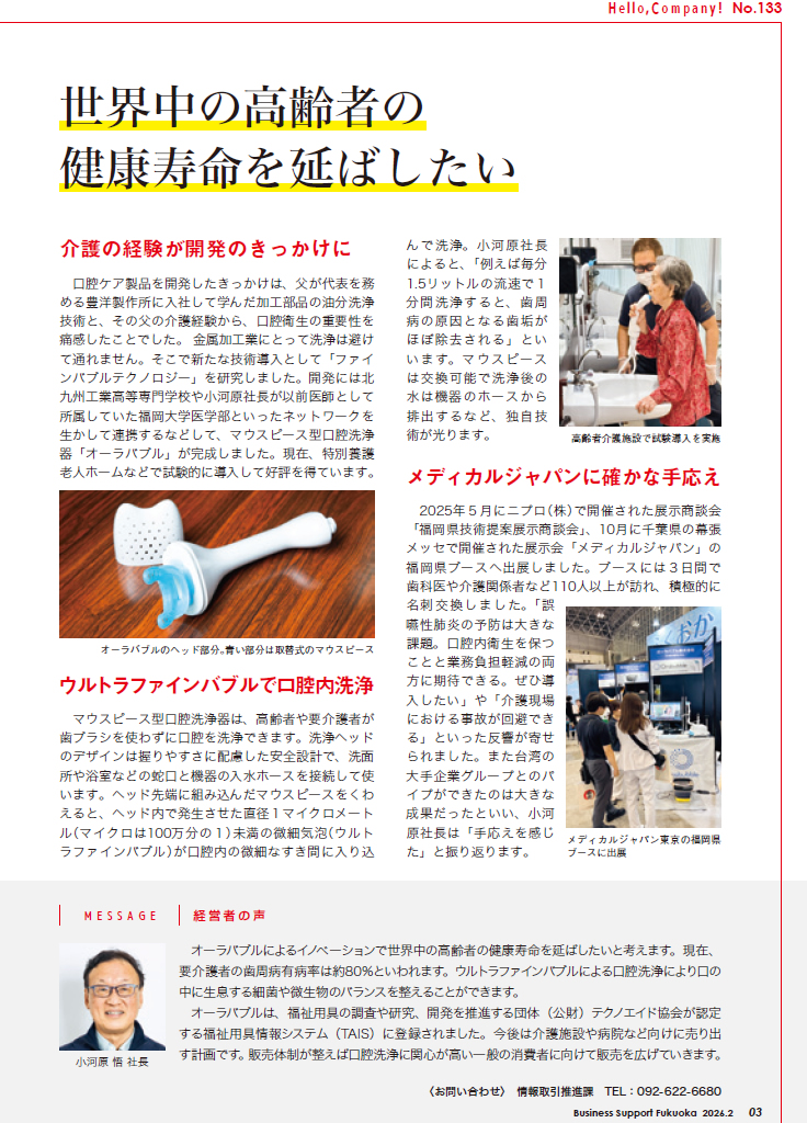 公益財団法人・福岡県中小企業振興センターが発行する中小企業の経営に役立つ最新情報満載の経営支援情報誌「ビジネスサポートふくおか」にて、介護機器ベンチャーとして弊社並びに弊社製品のオーラバブルが紹介されました。